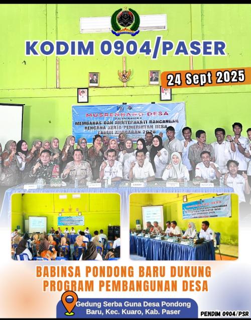 Kodim 0904/Psr, Korem 091/ASN, Kodam VI/Mlw - Babinsa Pondong Baru Serda Darwit Jaya hadir dalam Musyawarah Desa (MUSDES) dan Penyusunan RKP Desa Tahun 2026 yang bertempat di Gedung Serba Guna Desa Pondong Baru, Kec. Kuaro, Kab. Paser, Rabu(24/9/2025).