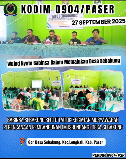 Kodim 0904/Psr, Korem 091/ASN, Kodam VI/Mlw - Bertempat di Gor Desa Sebakung telah dilaksanakan kegiatan Musyawarah Perencanaan Pembangunan (Musrenbang) Desa Sebakung, Sabtu(27/9/2025).